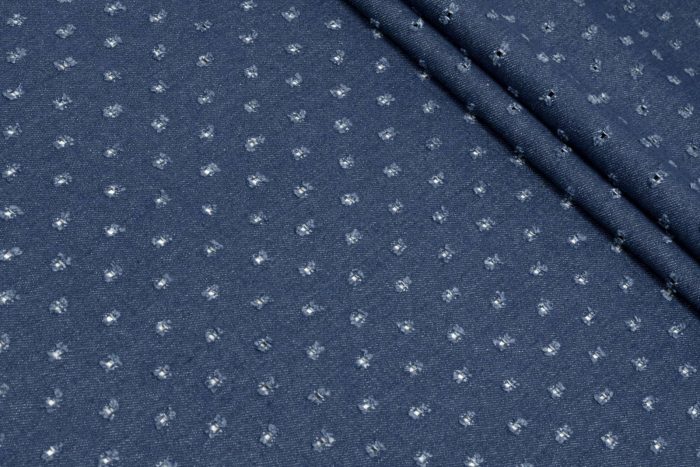Прочный джинс с классическим диагональным переплетением и сквозной перфорацией расположенной в шахматном порядке, симметрично по всей поверхности полотна. Фактура имеет характерный для джинса, слегка красящий эффект, что предполагает декатирование ткани отдельно от других материалов. Материал не растяжимый и устойчивый, гигроскопичный, непрозрачный. При драпировке образует выразительные складки. В применении практически универсален, используется для пошива классических джинсов, костюмов, платьев, юбок, парок, курток, комбинезонов, жилеток, аксессуаров, а также головных уборов. Отлично сочетается с однотонным, мраморным джинсом под артикулом 239.