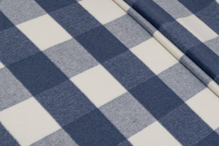 Материал плотный, непрозрачный, не эластичный по ширине и длине, с рисунком. Рекомендованная лицевая сторона имеет короткий ворс в тон основной нити, а сам рисунок выполнен методом переплетения контрастной нити основы, размер клетки 9х10 см. Тактильно приятный, мягкий материал. Используется для пошива пальто, кардиганов, курток, пончо и других видов плечевых изделий на подкладке и без, а так же головных уборов. В изделиях ложится достаточно мягко, не образуя грубых форм.