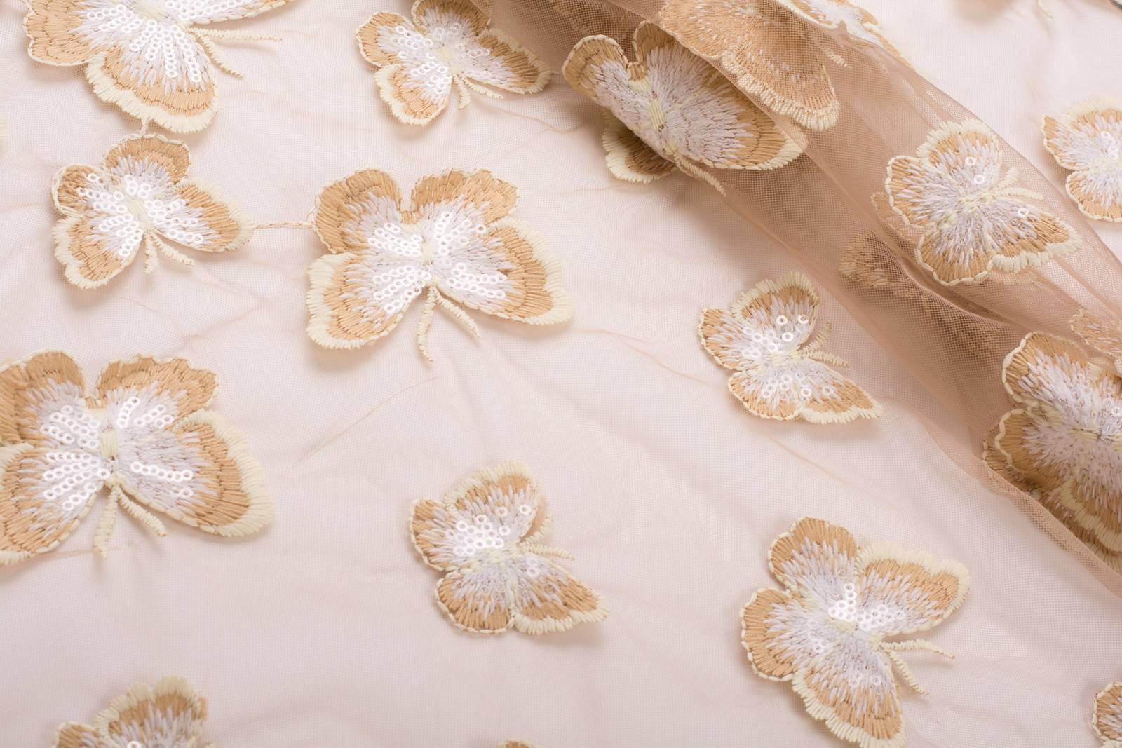Материал тонкий, прозрачный, с низким уровнем эластичности основы по ширине. Вышивка на ткани выполнена из нити в тон основы, с сатиновым блеском. Несминаемый, приятный тактильно на ощупь, мягкий материал, в изделии достаточно увесистый. Ведет себя пластично, благодаря чему легко выкладывается по любой форме. Используется как для пошива одежды на подкладке, так и для отделки или декора отдельных деталей, отлично делиться на фрагменты. Используется для пошива блуз, топов, платья, юбок, вечерних и свадебных нарядов. Материал имеет ажурный фестон с двух сторон по кромке.